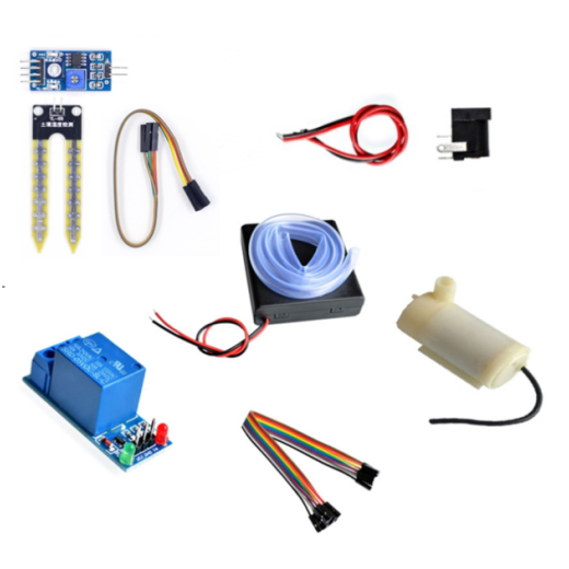 Sada obsahuje všechny potřebné komponenty pro snadnou instalaci a provoz: senzor vlhkosti s sondou, releový modul, bateriový modul (baterie nejsou součástí balení), DC konektor, vodní čerpadlo a propojující vodiče Dupont spolu s 50 cm zavlažovací hadicí. Celý systém je napájen z 5V DC (4x AA baterie).