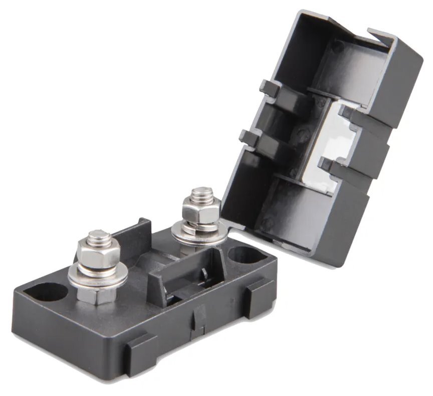 Držák určený pro pojistky Victron MIDI. Má odnímatelnou krytku a pojistky se připevňují na dvojici šroubů M5.