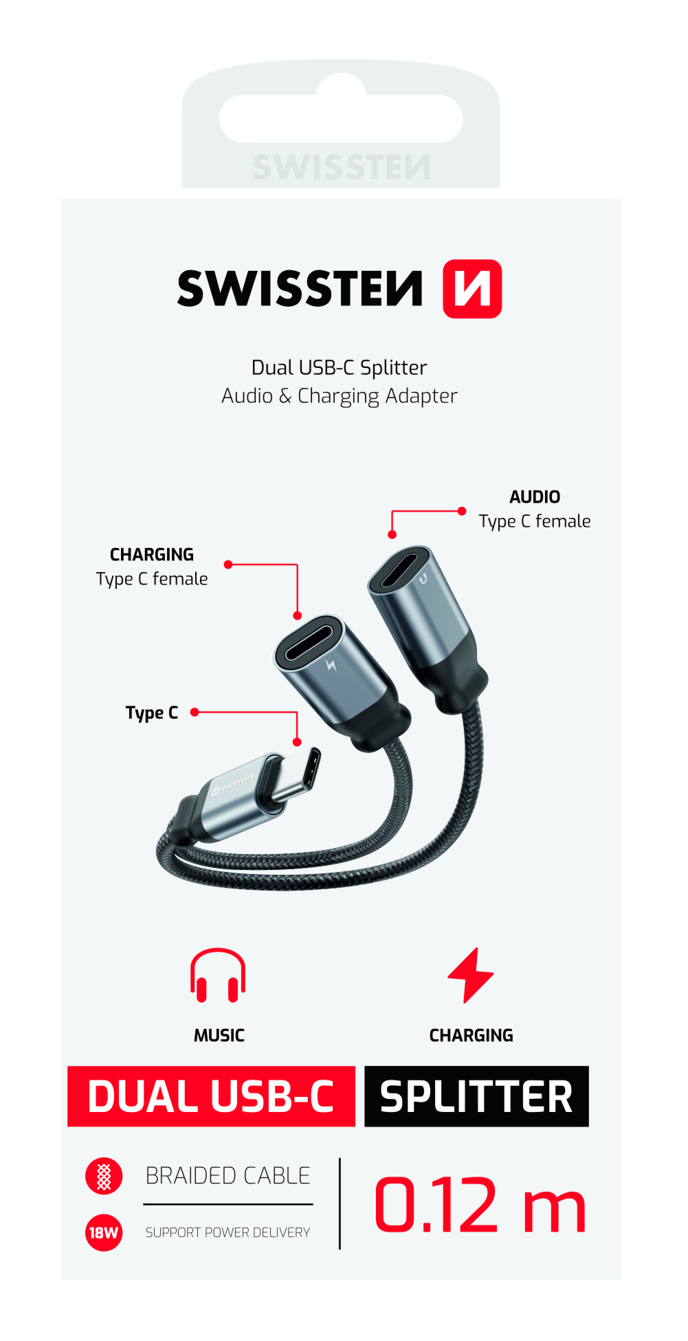 NABÍJECÍ AUDIO ADAPTÉR SWISSTEN TEXTILE USB-C (samec) / 2x USB-C (samice) 0,12 M ČERNÝ