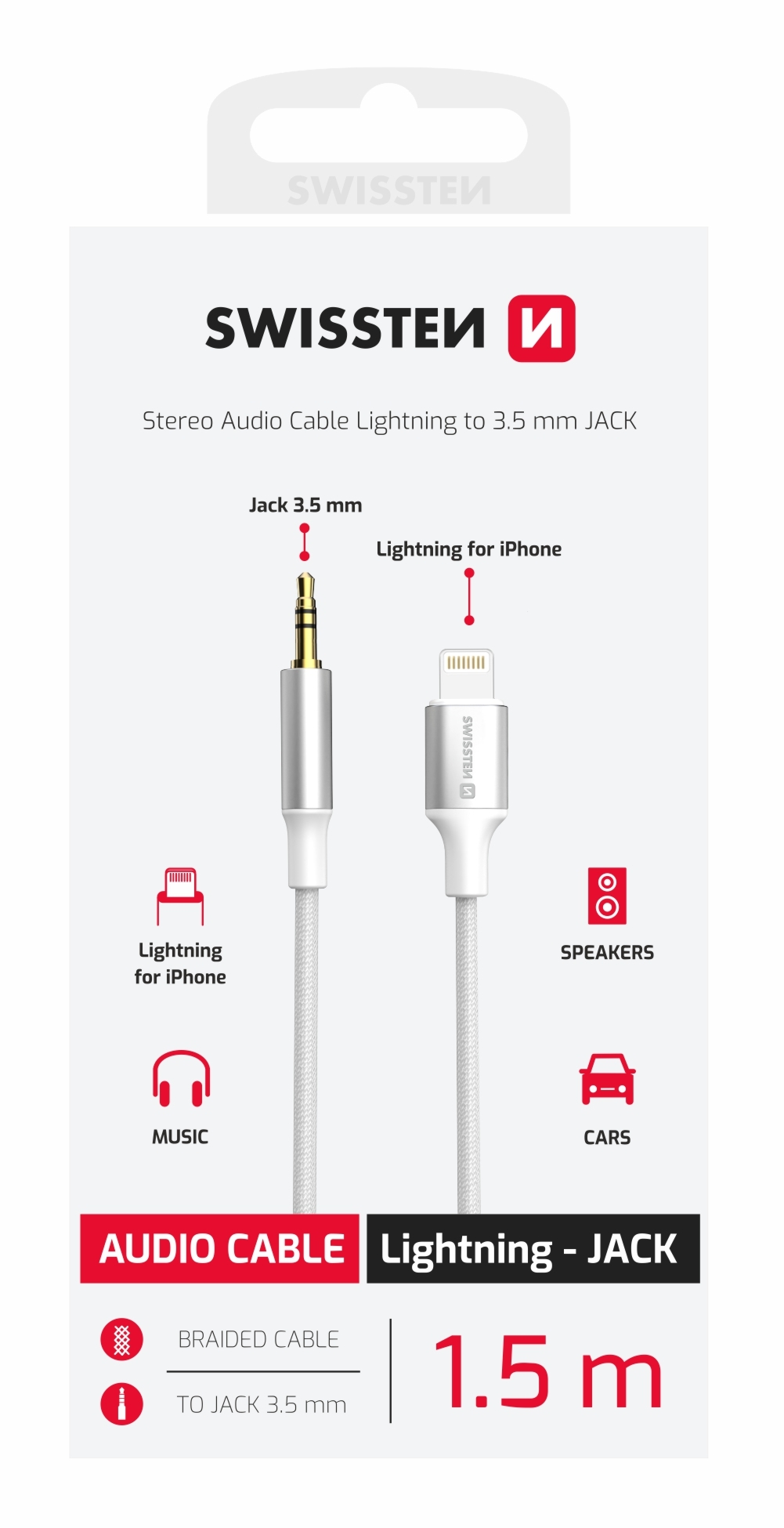 AUDIO ADAPTÉR SWISSTEN TEXTILE LIGHTNING (samec) / 3,5 mm JACK (samec) 1,5 M BÍLÝ