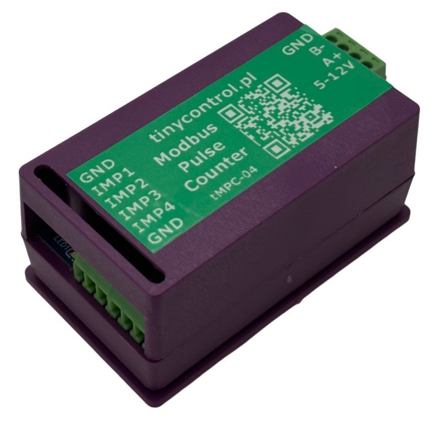 4vstupový pulzní čítač určený pro použití s libovolnými měřiči s pulzními výstupy. Komunikuje prostřednictvím protokolu Modbus RTU a poskytuje údaje o počtu pulzů, vypočítané energii a odhadovaném výkonu. Lze jej využít i pro měření dalších veličin, např. průtoku vody nebo plynu.