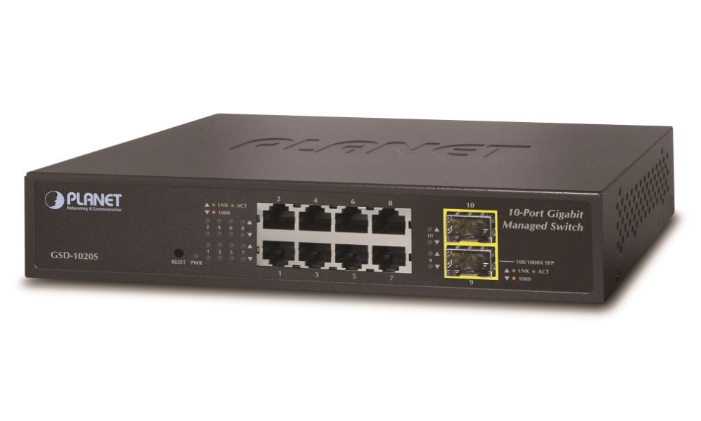 Planet GSD-1020S switch 8x 1000B-T, 2x SFP 100/1000B-X, SNMPv3, VLAN, QoS, STP/RSTP, IGMPv3, IPv6, fanless