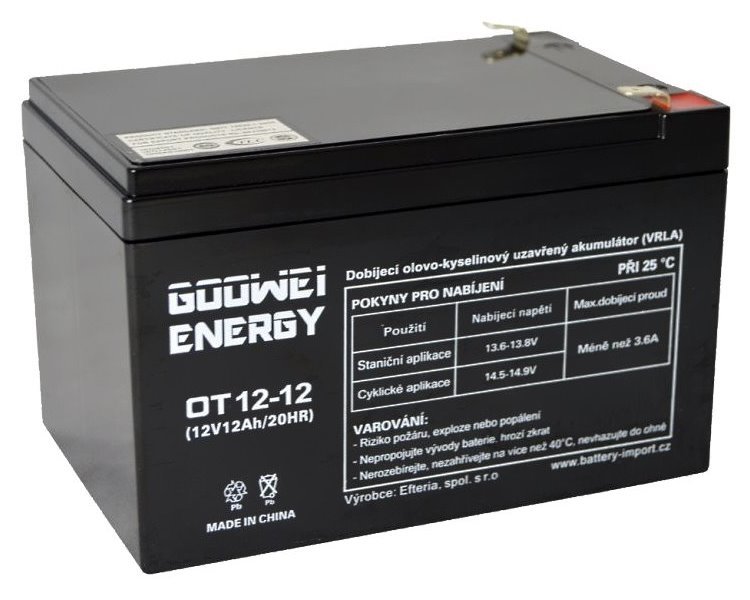 GOOWEI ENERGY OT12-12 je 12V/12Ah olověný akumulátor v technologii VRLA (ventilem řízené olověné-kyselinové baterie) s technologií AGM, která zadržuje elektrolyt v sklolaminátových mikrovláknech. Díky tomu je baterie bezúdržbová, otřesuvzdorná a prakticky bez úniku elektrolytu. Je ideální pro záložní zdroje, bezpečnostní systémy, telekomunikační zařízení, nouzové osvětlení a další aplikace, kde je potřeba spolehlivé neustálé napájení.