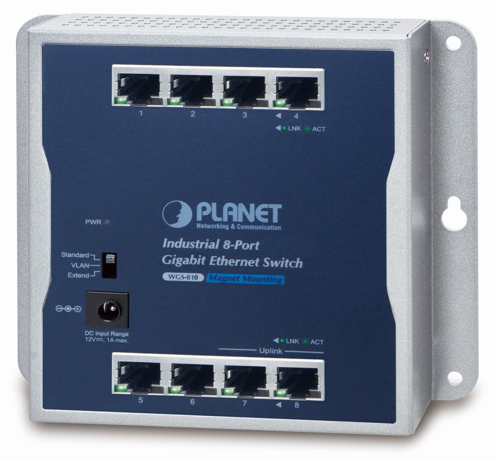 PLANET průmyslový nástěnný switch 8x 1Gb, IP30, 12VDC, -20/+60st, IP30, fanless