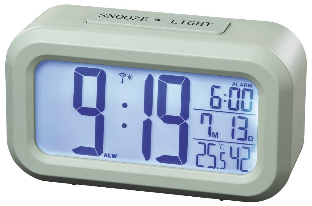 Tento moderní budík nabízí digitální zobrazení času, data, teploty a vlhkosti vzduchu. Můžete si nastavit až dva různé časy buzení, což je ideální pro páry, které mají jiné vstávací návyky. Navíc lze budík nastavit tak, aby zvonil pouze v pracovní dny, což oceníte o víkendech i dovolených. Díky světelnému senzoru se v noci automaticky zapíná příjemné bílé LED podsvícení, které si také můžete manuálně aktivovat na 5 sekund jednoduchým stiskem tlačítka - perfektní pro snadné prohlédnutí času i za tmy.