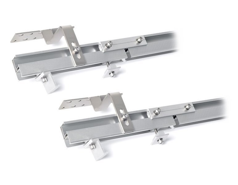 Precizní a na instalaci jednoduchý kompletní držák SC pro dva solární panely s výškou rámu 35 mm. Obsahuje všechny potřebné díly pro upevnění dvou panelů na taškovou (sedlovou) střechu.