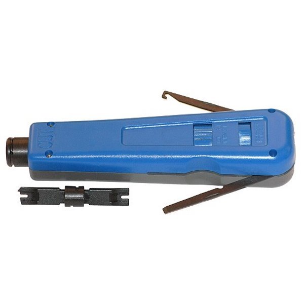 Nastřelovač pro patch panely a zásuvky s nastavitelnou tuhostí pružiny. Poloha HI pro vysokou tuhost a poloha LO pro tuhost malou. Do spodní části rukojeti lze vložit ostří pro transporty s aretací. Uvolnění při točení dle naznačené šipky. Z boku lze využít nástroj pro vytažení drátu z patch panelu a srovnat drát uvnitř.