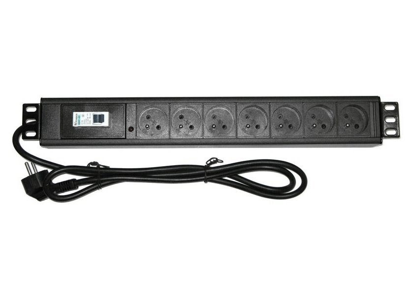 19" rozvodný panel 7x 230 V, zásuvky dle ČSN, indikátor napětí, jistič typu C16, výška 1,5U, 1,8 m přívod.