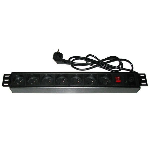 19" rozvodný panel 7x 230 V, zásuvky dle ČSN, indikátor napětí, nadproudová ochrana, max. proud 16 A, výška 1,5U, 1,8m přívod.