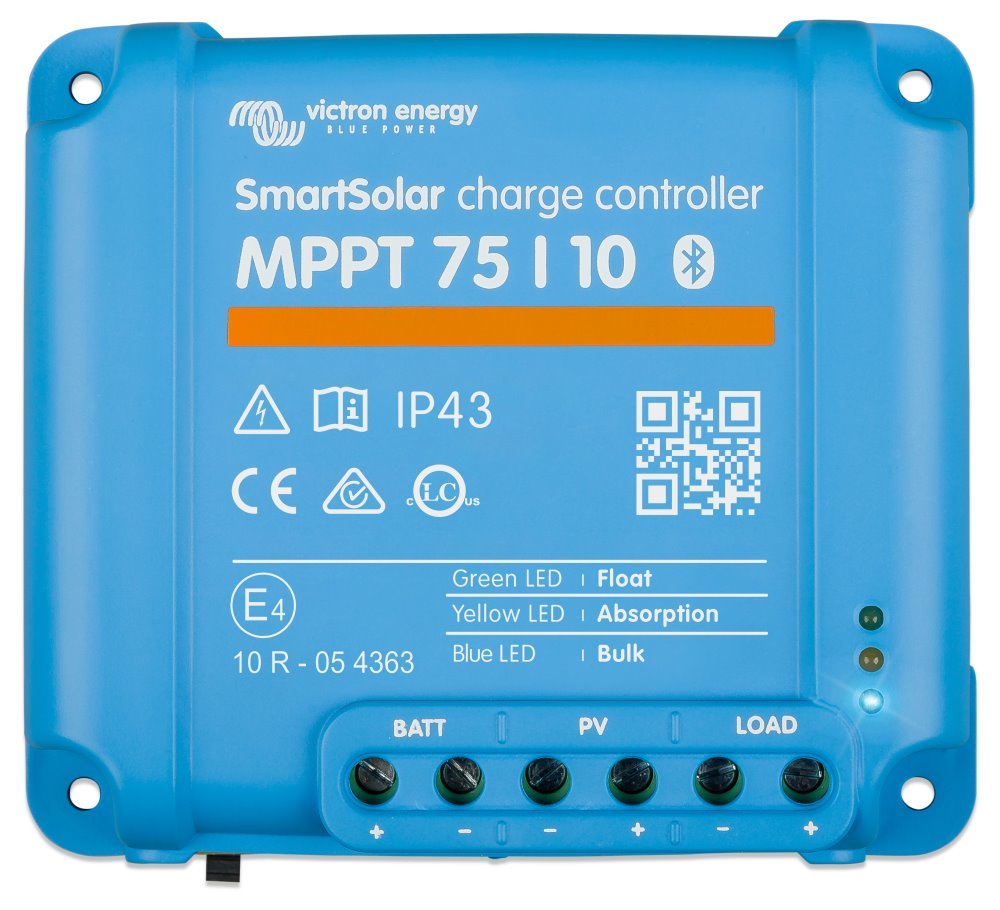 Robustní a rychlý MPPT regulátor pro náročné podmínky s napětím panelů až 75 V, maximální nabíjecí proud 10 A. Baterie 12/24 V, FV max. 145/290 Wp. Vestavěné Bluetooth a VE.direct rozhraní.