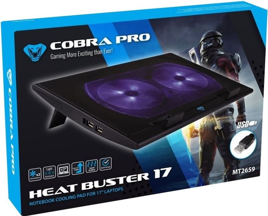 HEAT BUSTER 17 je chladicí podložka z herní série COBRA PRO, vybavená dvěma velkými a tichými ventilátory. Poskytuje stabilní základnu pro notebook s možností 2stupňového nastavení výšky. Další výhodou jsou malé zámky zabraňující sklouznutí notebooku. Tiché ventilátory berou studený vzduch zpod podstavce a směřují jej ke spodní části notebooku.HEAT BUSTER je napájen z USB portu.Media-Tech MT2659 Cobra PRO Head Buster 17 - chladící podložka pro notebook 15, 5 až 17 palců, černá