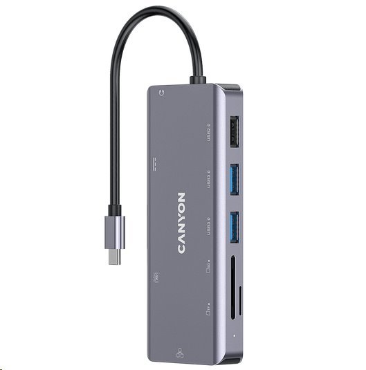 CANYON replikátor portů DS-11 9v1, 1xUSB-C PD 100W, 1xHDMI (4K), 3xUSB-A, RJ45 Gb, 3.5mm jack, SD/micro čtečka
