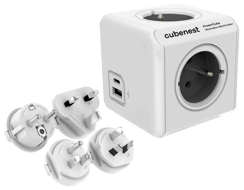 Cubenest Powercube ReWirable USB PD 20W, A+C, 4× zásuvka, bílá/šedá, 4 cestovní koncovky, dětská pojistka, uzemnění