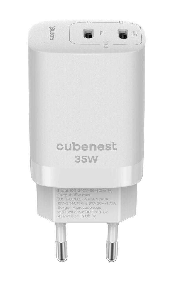 Kompaktní napájecí adaptér s výkonem až 35 W disponuje dvěma USB-C porty. Díky tomu umožňuje nabíjení dvou zařízení současně. Kromě tradičního nabíjecího formátu Power Delivery 3.0 disponuje také novým Power Delivery PPS, který je výrazně šetrnější k baterii a tím prodlouží její životnost. Použitá GaN technologie snižuje tvorbu tepla, čímž zvyšuje účinnost nabíječky při zachování kompaktních rozměrů. Samozřejmostí je tepelná, přepěťová, proudová a zkratová ochrana.