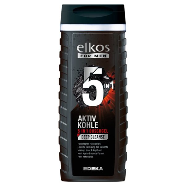Elkos Men Sprchový gel 5v1 Active Kohle - multifunkční sprchový gel s aktivním uhlím - 300mlKvalitní prémiová značka Elkos je tou nejvyšší řadou privátní značky Edeka, která se zabývá výrobou a prodejem nejen kosmetických produktů. Elkos je německá kvalita za velmi příjemnou cenu! Skvělý sprchový gel pro každodenní použití, který šetrně pečuje o celé Vaše tělo a zanechává ho hebké a vyživené. Dokonalá vůně pro aromaterapii.Funkce 5v1 vhodné pro tělo, obličej i vlasy s aktivním uhlím pro hygienickou čistotu příjemná pánská vůně Hydro Balance - formule pro udržení vlkosti v pokožce neutrální pH, dermatologicky testováno