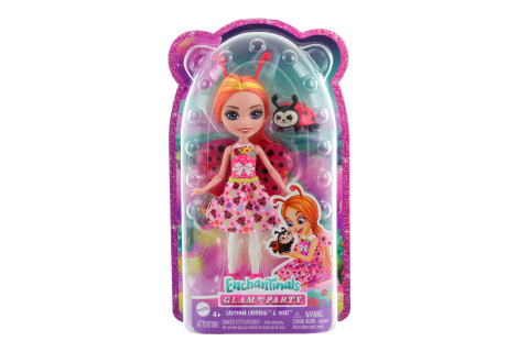 Seznamte se s Enchantimals™, skupinou roztomilých dívek, které mají mimořádné pouto se svými nejlepšími zvířecími kamarády! Z kolekce Glam Party™ přichází panenka Ladonna Berušková (15 cm) se svým roztomilým mazlíkem - jsou vždy spolu a navíc vypadají podobně! Malé děti budou zbožňovat panenku s jejími dlouhými vlasy, tečkovanými křídly a tykadly. Panenka je stylově oblečena do růžové odnímatelné sukýnky se zlatým páskem a potiskem berušek a kytiček a parádních bot. Barvy a vzhled výrobku se mohou lišit. Panenky nemohou stát samostatně. Věk 4+
