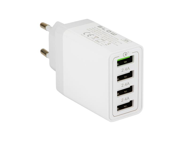 Nástěnná nabíječka se čtyřmi USB zásuvkami. Nabíječka je určena pro zařízení, která lze napájet/nabíjet z USB portu. Funkce SMART sama upraví bezpečné napětí a nastaví maximální rychlost nabíjení.