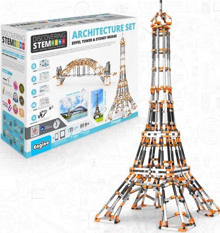 Souprava Architecture demonstruje schopnost stavět modely ENGINO působivé velikosti a stylu, vhodné pro věk 9+. Děti objevují různé typy staveb a staví dva velké modely mostu v Sydney a Eiffelovy věže! Souprava je doplněna o modely menších rozměrů včetně lanového mostu, visutého mostu, obloukového mostu, příhradového mostu a domu z tištěné brožury s návodem a online. Kniha praktických aktivit obsahuje vše, co studenti potřebují vědět o technologickém pokroku v architektuře, s teorií a vzrušujícími experimenty a kvízy s jejich řešeními.