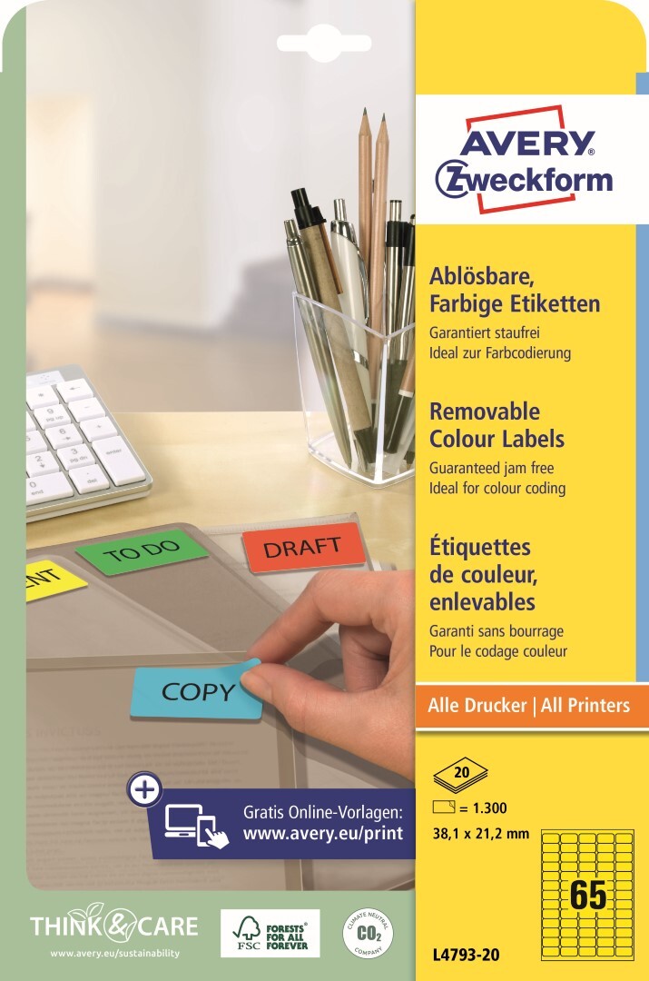 Avery Zweckform L4793-20 Barevné etikety 38,1 × 21,2 mm, 1 300 ks, 20 archů A4, žluté, snímatelné