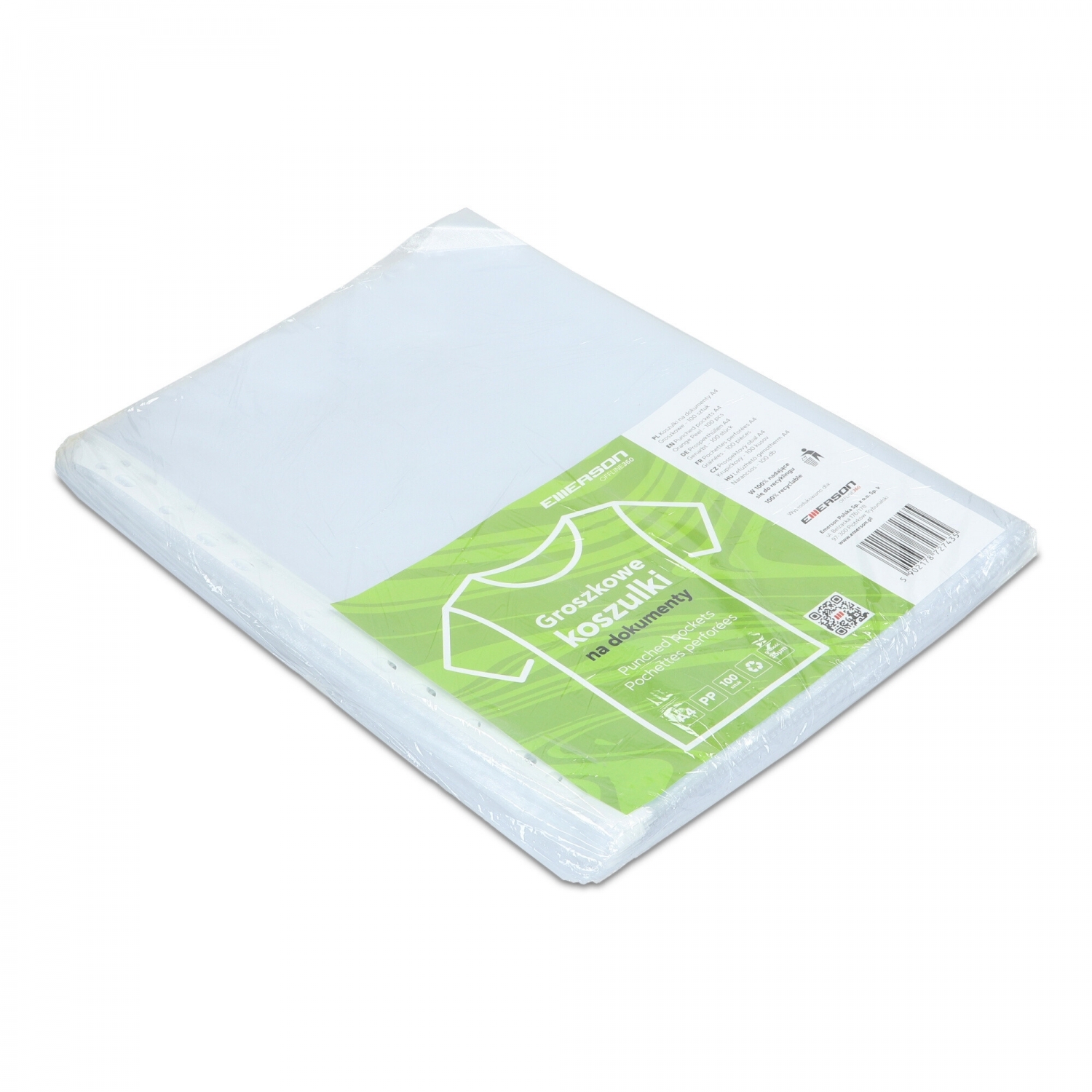 Opis Koszulki groszkowe są jednym z podstawowych elementów wyposażenia każdego biura. Spełniają liczne funkcje m.in. zabezpieczają dokumenty, dzięki nim sprawnie posegregujemy papiery w segregatorach, stanowią oprawę dla informacji wywieszanych na tablicach. Wykorzystamy je również podczas konferencji, prezentacji, tworzenia katalogów. Koszulki groszkowe mają nierówną strukturę, nie są na nich widoczne odciski palców i zarysowania. Świetnie sprawdzają się do przechowywania dokumentów w segregatorach.Kategoria Koszulki folioweRodzaj GroszkoweGrubość 35 micPKWiU 22.29.25.0Asortyment / Kod CN 3926 10 00Jednostka sprzedaży opakowanieStawka VAT 23 Kod kreskowy kartonu 5902178731326Kod kreskowy opakowania 5902178727435Ilość w opakowaniu 100 szt.Ilość opakowań w kartonie 10Ilość kartonów na palecie 140Waga jednostki sprzedaży kg 0,10Kraj pochodzenia PolskaProducent/Importer Emerson Polska Sp. z o.o. Sp. k.Ulica i nr ul. Belzacka 176/178Kod pocztowy, Miasto 97-300 Piotrków TrybunalskiAdres www www.emerson.pl/kontaktAdres e-mail w sprawie bezpieczeństwa produktu gpsr emerson.plTelefon 48 44 649 06 50CE Nie dotyczy
