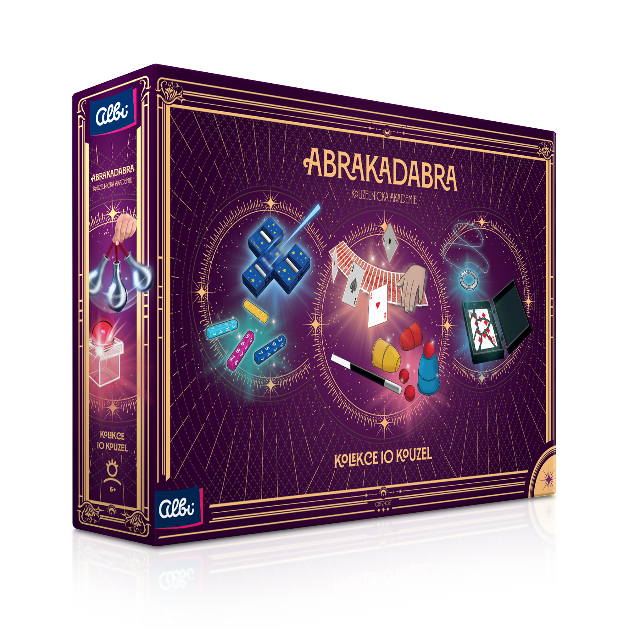 Sada 10 skládacích kouzelnických hraček a návodu, jak na ně. Pro malé kouzelníky od 6 let, kteří se díky sadě naučí kouzelnické triky. Sada obsahuje: 10 kouzel - Úžasné pouzdro na karty, Kelímky a kuličky, Rozřezání a obnovení tyčky, Vznášející se váza, Kouzelná tiskárna peněz, Mizející kulička, Superpočítač, Kroužek na řetízku, Balíček kouzelnických karet, Polykač mincí a návod.