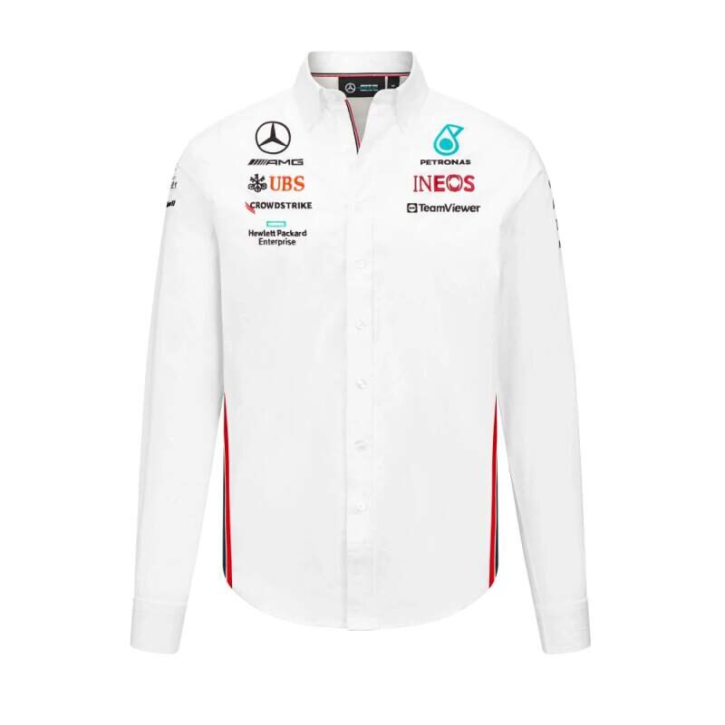 Bílá týmová košile Mercedes AMG Petronas F1. Košile nošená piloty a členy týmu v sezóně Formule 1. Bílá týmová košile Mercedes Formule 1 v krásném provedení. Pohodlné na nošení, týmová loga, bavlna, prvky Tommy Hilfiger, vyšitá loga. číst celé