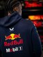 Luxusní týmová mikina s kapucí týmu Formule 1 Oracle Red Bull Racing. Tmavě modrá barva doplněná luxusním potiskem Red Bull a logy sponzorů. Příjemný materiál, kapuce.