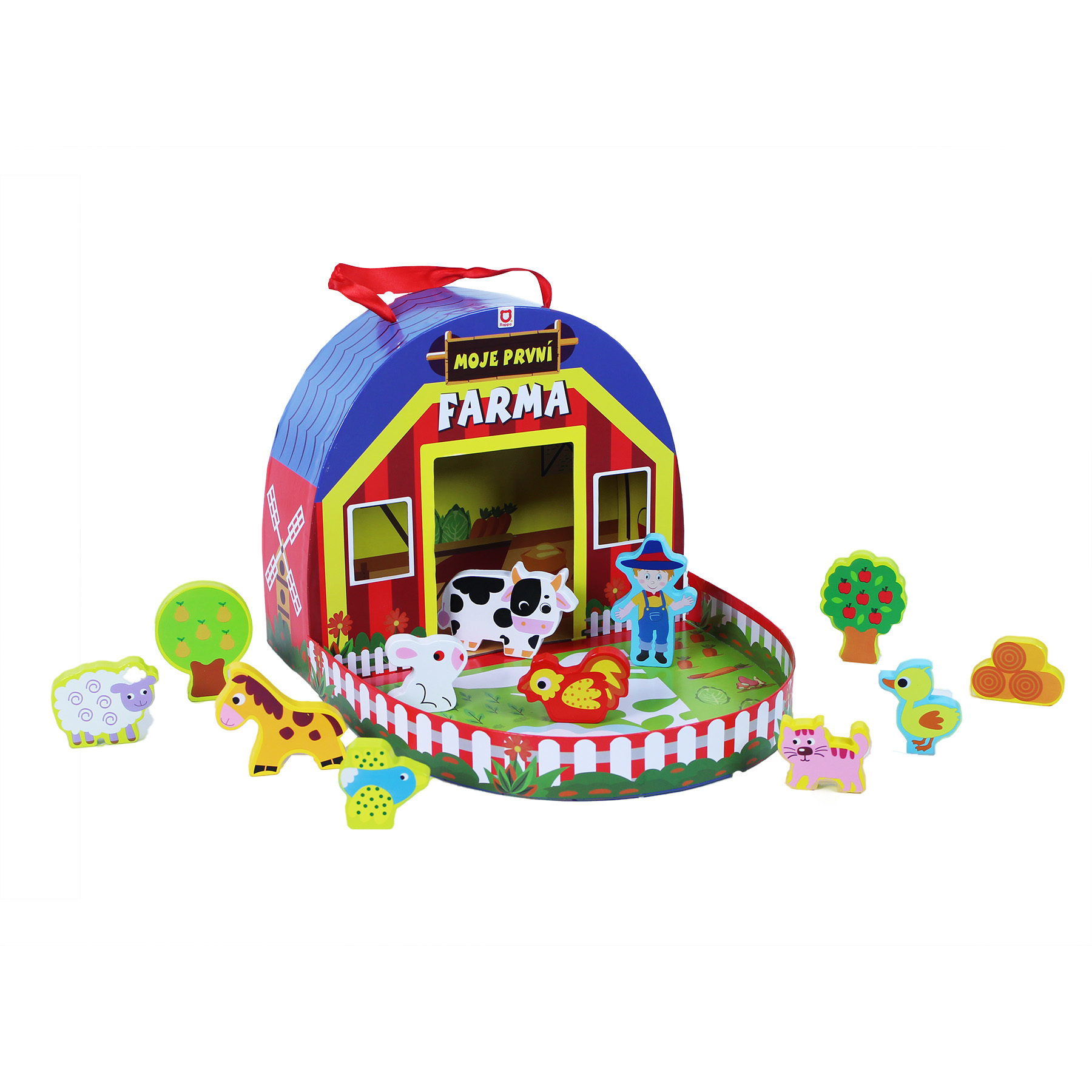 Dřevěné figurky s motivem farmy v pestrobarevném kufříku. Sada obsahuje 12 ks dřevěných figurek zvířat a rostlin.