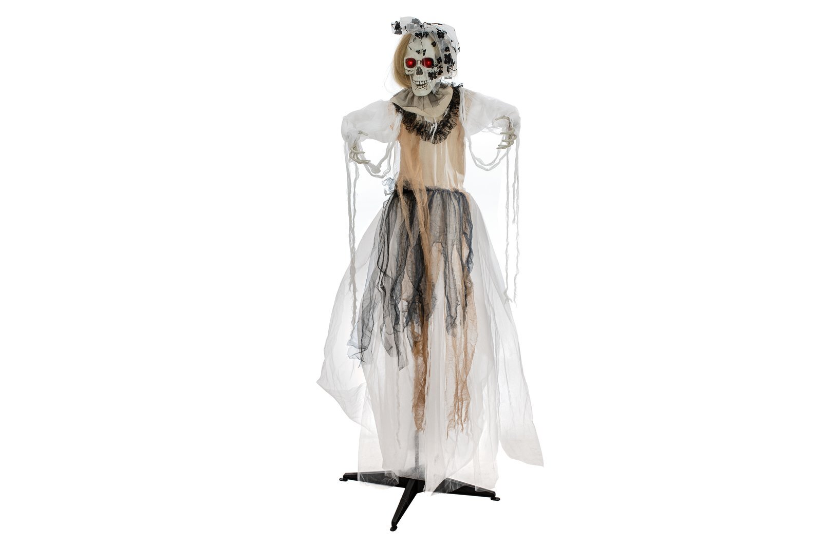Tato pohyblivá postava kostry nevěsty vysoká 170 cm je oblečena ve svatebních šatech a má vlasy svázané stuhou, čímž vypadá autenticky a působivě. Zoufale zvedá ruce nahoru a dolů, signálizující smutek nad nepřítomností ženicha, přičemž kroutí hlavou ze strany na stranu a její oči blikají červenými LED světly. Pohyb lze aktivovat několika způsoby - přes integrovaný mikrofon, spínací podložku "Step here" nebo drátové ruční ovládání, což umožňuje snadné řízení efektu podle potřeby.
