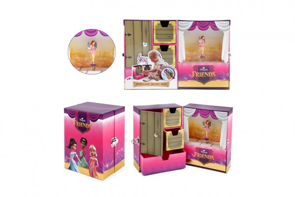 Žádné malé parádnici by neměla chybět šperkovnice na její nezbytnosti. Skříňku s točící se vílou stačí ze zadu natáhnout a rozezní se líbezná melodie. Šperkovnice s princeznami v dívčí růžové barvě, kter uchová všechny poklady malých slečen: náramky, náhrdelníky a jiné tajné věci. Velikost šperkovnice: 27 x 18 x 6 cm Vhodné od 14 let