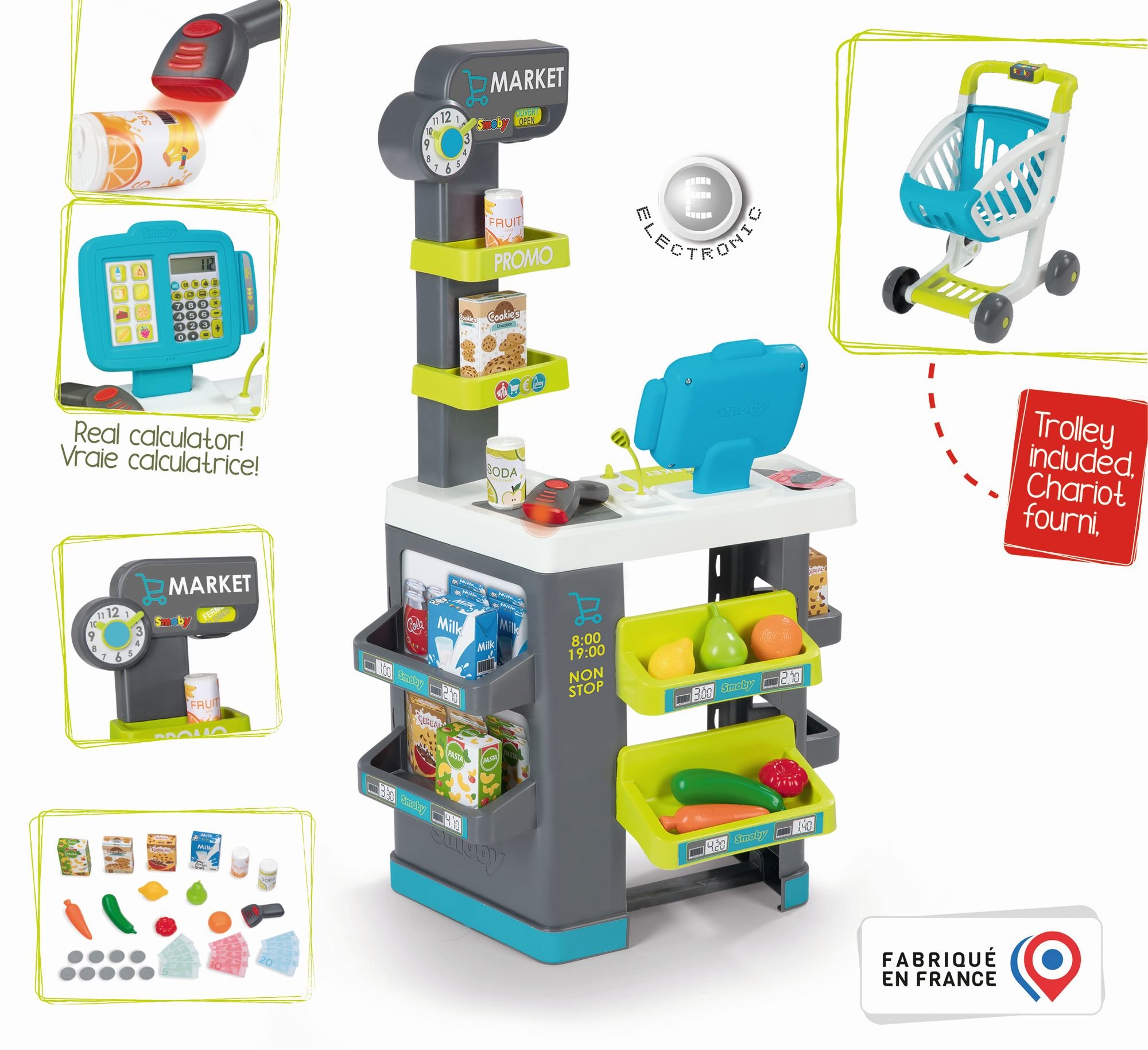 Smoby supermarket s elektronickou pokladnou s LCD displejem, s integrovanou kalkulačkou, se skenerem s funkcí zvukového signálu a světla, nastavitelnými hodinami a spoustou příslušenství. Včetně nákupního košíku, do jehož rukojeti lze vložit minci. Pokladník může použít mikrofon (bez funkce), bankovky a mince lze uložit do výklopné přihrádky na peníze. Děti se tak hravou formou učí, jak správně zacházet s penězi. Sortiment je pestrý a nabízí ovoce a zeleninu, sladkosti a makety obalů potravin. Veškeré zboží lze přehledně vystavit v regálech supermarketu. Rozměry (DxŠxV): 48,9 x 38,5 x 89,6 cm.