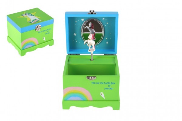 Skříňka šperkovnice jednorožec hrající na natažení dřevo odklápěcí vrch zelená 12,5x10,5cm v krabici