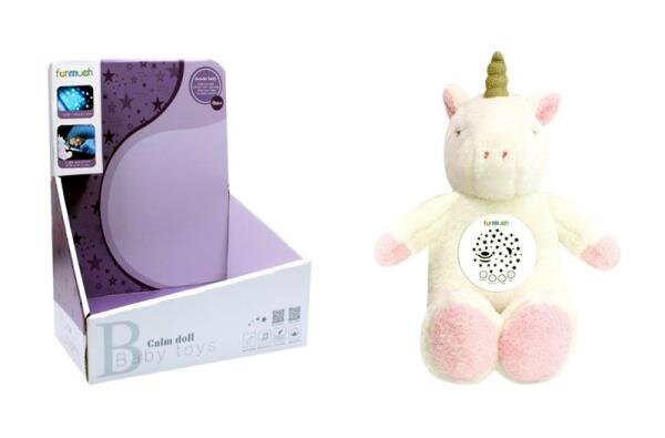 Jednorożec projektor może uprzyjemnić Twojemu maluszkowi usypianie, a Tobie ułatwić nocną zmianę pieluszki czy karmienie. Piesek może rozświetlić sufit nad łóżeczkiem maluszka gwiazdozbiorem w różnych kolorach, co przyda ci się na przykład podczas opowiadania bajki na dobranoc. Posiada efekty dźwiękowe oraz świetlne. Zabawka wykonana z pluszu oraz plastiku. Wymaga zasilania bateriami: 3x1,5V AAA (nie załączono do zestawu). Zalety produktu: pobudza wyobraźnię dziecka, uspokaja, wycisza, usypia niemowlaka.
