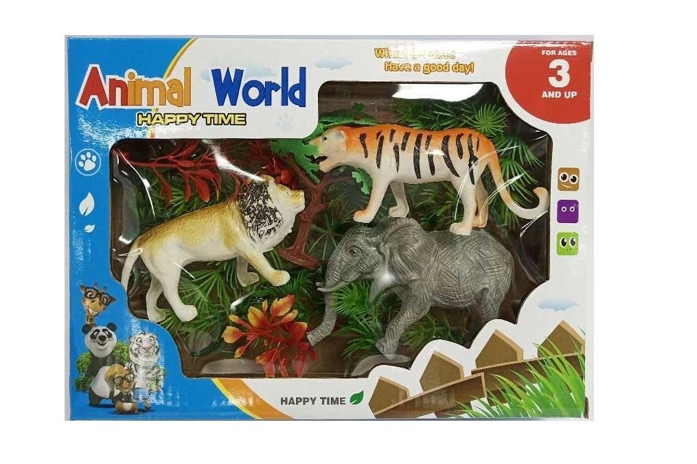 Zestaw 3 zwierząt zawierający figurkę lwa, tygrysa oraz słonia wraz z roślinnością číst celé