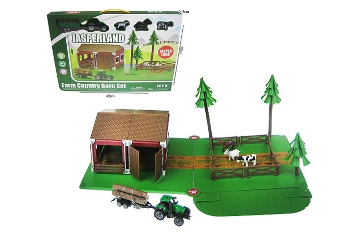 W skład zestawu wchodzi stodoła o wymiarach 18 × 18 × 12 cm, podstawa o wymiarach 54 × 35 cm, drzewka o wysokości 19 i 11 cm, traktor o wymiarach 7 × 5 cm z przyczepą 10 × 5 cm oraz trzy figurki zwierząt. Wszystkie elementy wykonano z plastiku, a całość liczy 72 części gotowych do złożenia.