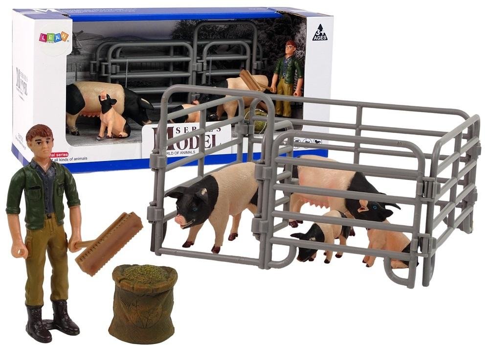 Figurki zwierząt z gospodarstwa domowego zapewne przypadną do gustu każdemu małemu gospodarzowi. Może stworzyć u siebie własną zagrodę i do tego zebrać zwierzęta różnego rodzaju. Wykonane z każdy, szczegółem przypominają prawdziwą wersję tych zwierząt. Możesz stworzyć własną kolekcję, która idealnie będzie prezentować się na półce małego gospodarza. Drugą opcją jest super zabawa, niech wyobraźnia podpowie twojemu dziecku, jak będzie spędzał wolny czas z naszymi figurkami. Rozmiary modeli są idealnie dopasowane do małych rączek, dzięki czemu będzie ćwiczył też chwyt i precyzję. Świnki mają kolor biało- czarny, szara zagroda stworzy przestrzeń dla figurek. A rolnik z miotłą zadba o porządek. Stwórz małą farmę w swoim pokoju ! Wysokości figurek: świnki duże: 10 cm x 3 cm x 6 cm świnki małe: 5 cm x 4 cm x 2 cm rolnik: 9 cm zagroda : 19 cm długości- jeden płotek wysokość - 9,5 cm Wymiary pudełka: 31 cm x 15 cm x 10,5 cm Zabawki przeznaczone są dla dzieci powyżej 3. roku życia. Figurki posiadają certyfikat CE i są zgodne z normą EN 71. Zapakowane jest w kartonik, dzięki czemu nadaje się idealnie na prezent.