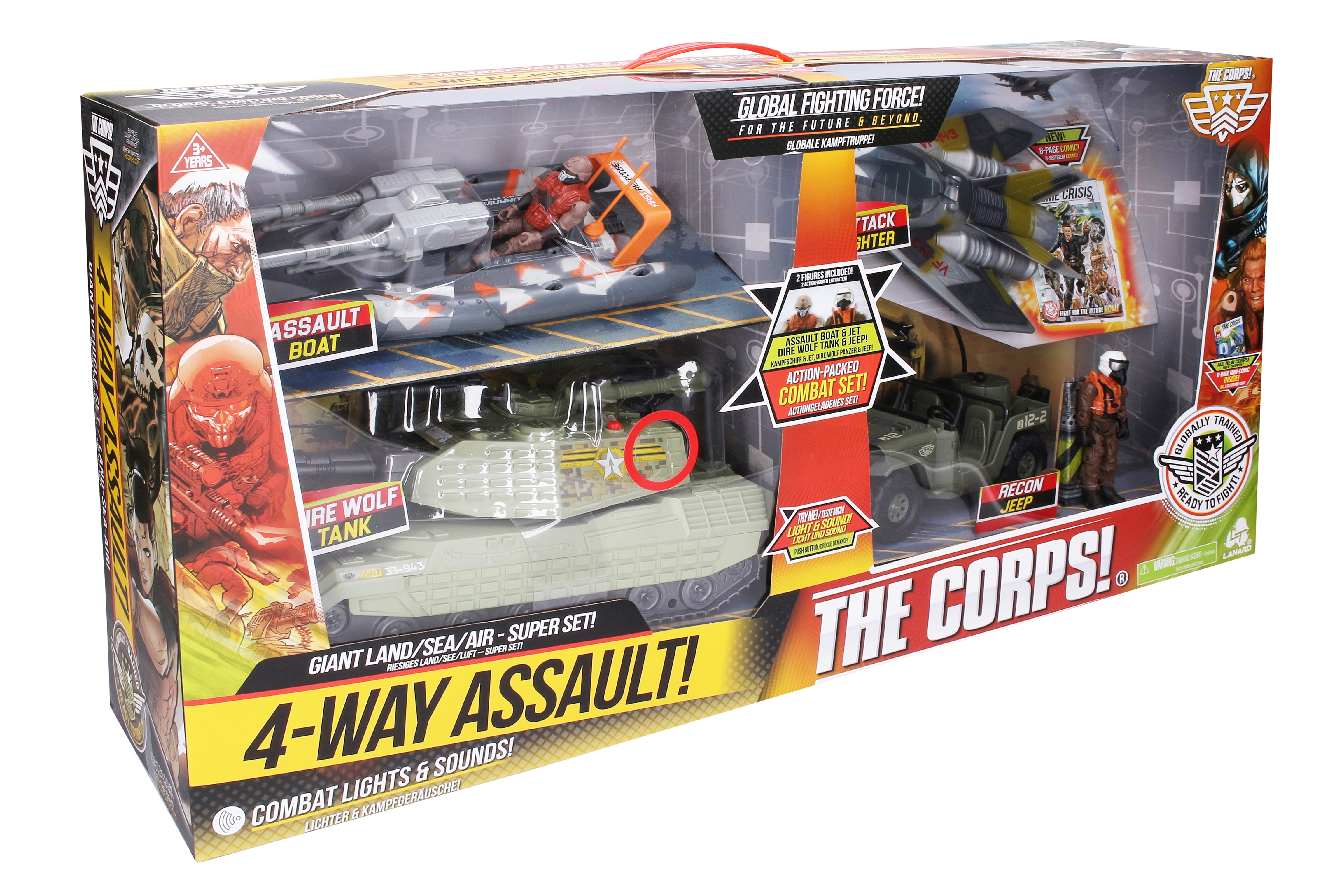 Vstup do drsného světa The Corps a zažij spoustu akce a zábavy! Pusť se do boje proti úhlavnímu nepříteli. Balení obahuje: 2 x figurku 8str. mini-komiks člun tank džíp stíhačku Doporučený věk: od 6 let