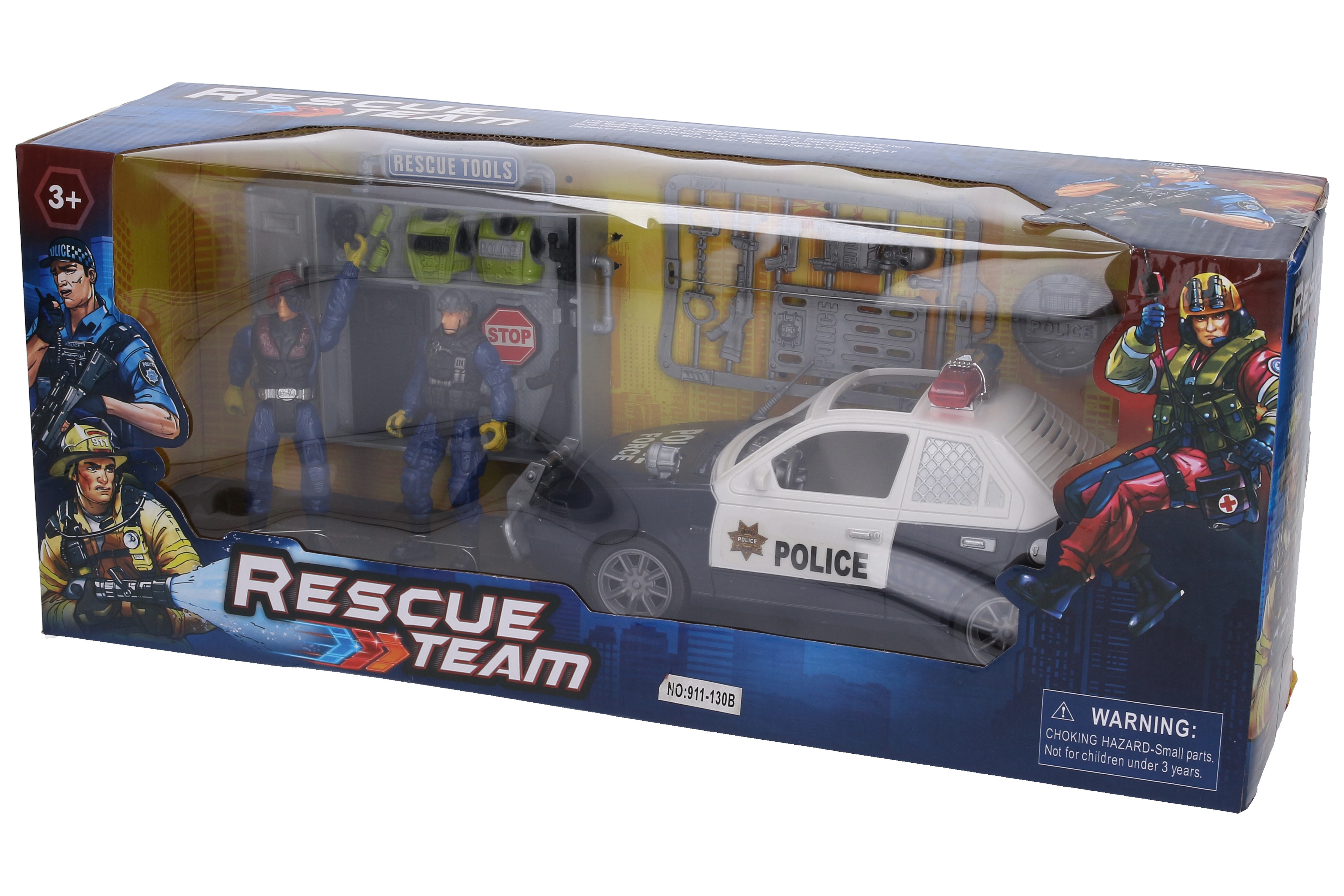 Policie sada figurky a auto. Obsah balení - policejní auto 26 cm, 2x figurka 10 cm, výstroj - zbraně, vesty, štíty. Volná kola.