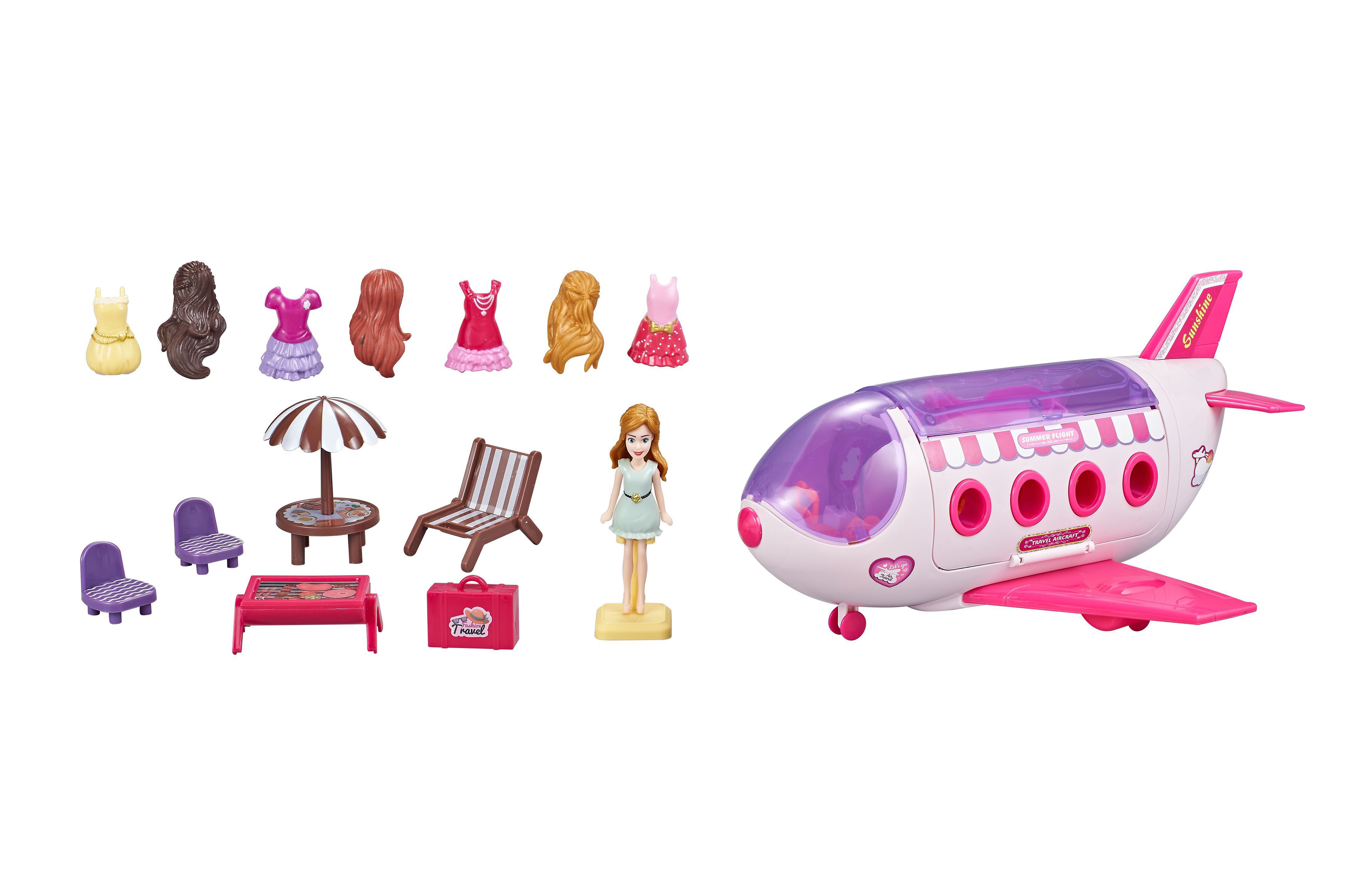 Letadlo s panenkou a příslušenstvím. Velikost letadla 28cm. Balení obsahuje letadlo, panenku, zahradní nábytek s grilem, šaty a vlasy pro panenku.