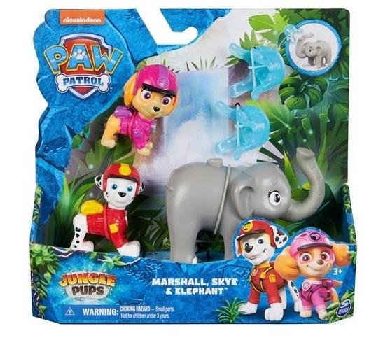 Zestaw pudełkowy zawierający dwie figurki szczeniąt Paw Patrol Jungle Pups i zwierzę z dżungli.