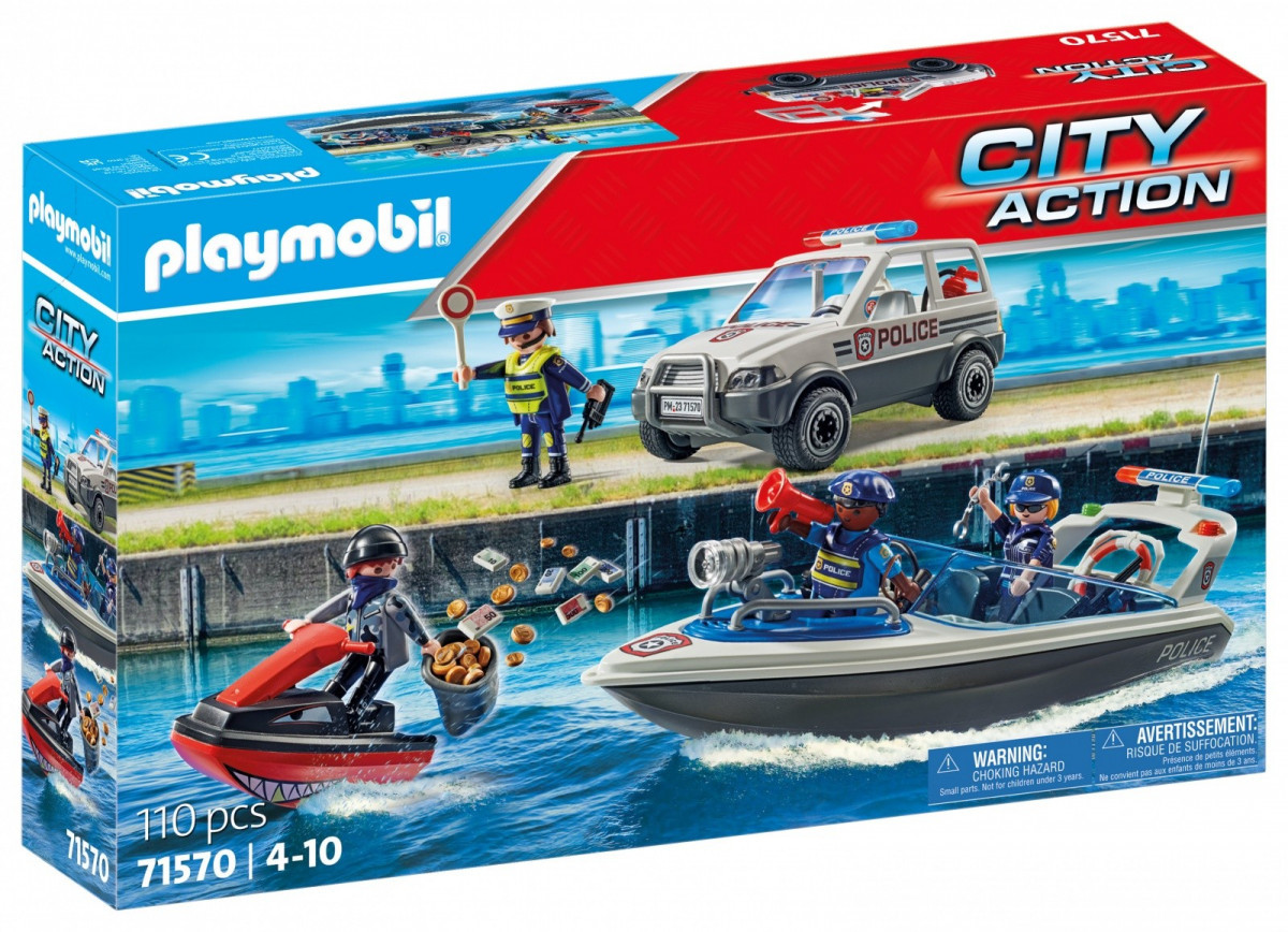 Zestaw PLAYMOBIL City Action Set 71570 zawiera cztery figurki, trzy pojazdy i mnóstwo akcesoriów do pełnego akcji pościgu policyjnego na wodzie!