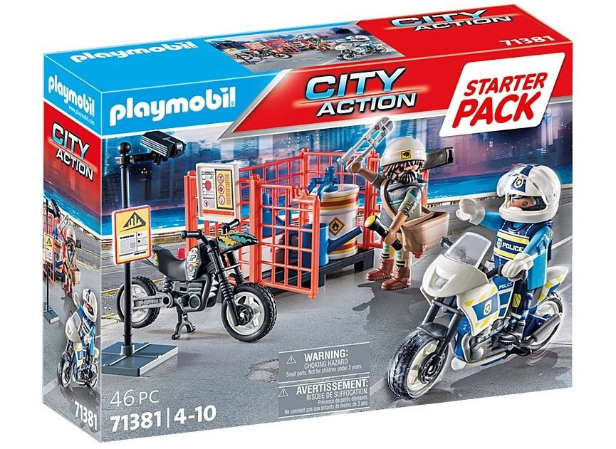 Starter Packs PLAYMOBIL to idealne wprowadzenie do wielkiego, kolorowego świata PLAYMOBIL. Zestaw zawiera dwie figurki PLAYMOBIL, motocykl policyjny, motocykl terenowy, latarkę, kamerę monitorującą i wiele innych ciekawych dodatków.