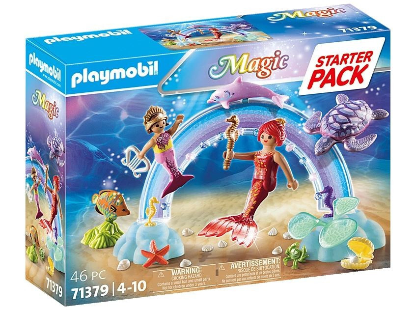 Starter Packs PLAYMOBIL to idealne wprowadzenie do wielkiego, kolorowego świata PLAYMOBIL. Zestaw zawiera dwie figurki PLAYMOBIL, małego delfina, żółwia morskiego, dwa koniki morskie, rozgwiazdę, tęczę, muszle i wiele innych magicznych dodatków. Tęczę można dowolnie udekorować za pomocą dołączonych ozdób w trzech kolorach.