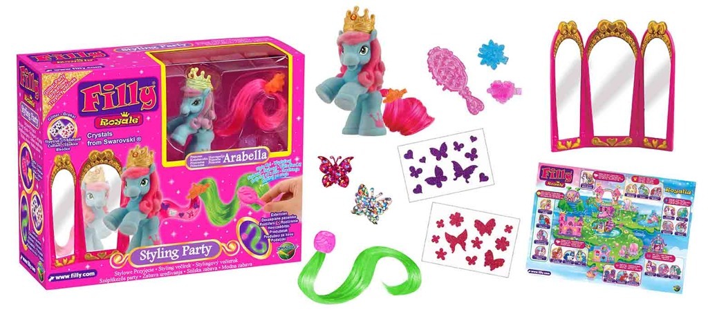 Vydejte se do Royalie, kouzelné země, ve které žijí koníčci Filly Royale. Všichni tito koníci mají krásné ocásky v tak úžasných barvách, že si to snad ani neumíte představit. Na jejich korunkách se třpytí krásné křišťály. Nechejte se pozvat princeznou Rainbow do její krásné duhové věže, kde se každou noc koná soutěž krásy. Vytvářejte koníčkům krásné účesy. Použijte originální sponky i hřebínek. To je nádhera.