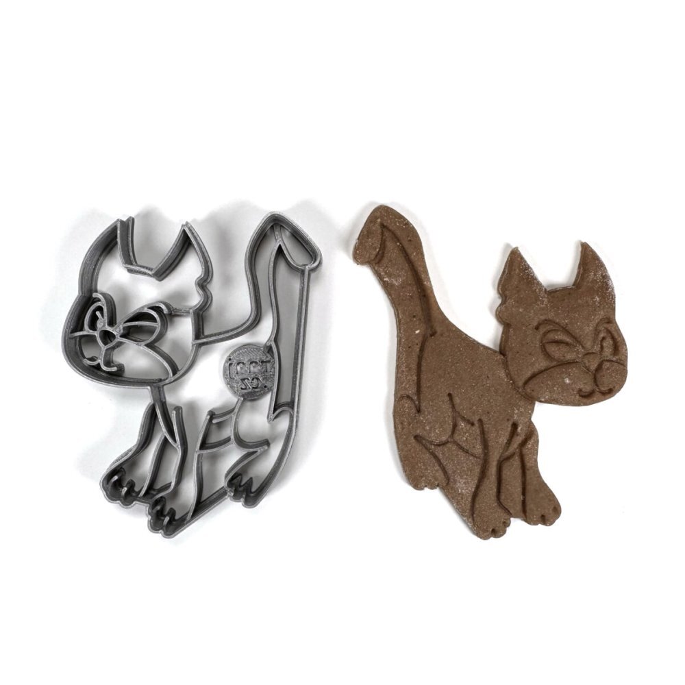 Vykrajovátko s motivem kocoura je vytvořeno pomocí 3D tisku, z plastového materiálu PLA (materiál biologicky odbouratelný), odolný do 50°C, nevhodný do myčky na nádobí. Pomocí otisku středních linií do hmoty bude zdobení zábavné a snadné nebo můžete ponechat i bez zdobení, jelikož vzhled bude krásně patrný. Tvořivými materiály jsou různé polotuhé hmoty jako je těsto (na perníčky, sušenky, linecké cukroví), fondán, marcipán, nebo umělé hmoty typu plastelína, Play-Doh, Modurit, keramická hlína, Fimo apod. Před prvním použitím a vždy po použití vykrajovátko omyjte jarovou vodou a důkladně osušte. Pro snazší vykrajování těst je vhodné vykrajovátko nejprve vložit do misky s moukou. Není určeno pro děti do 3 let, hrozí odlomení malých částí.