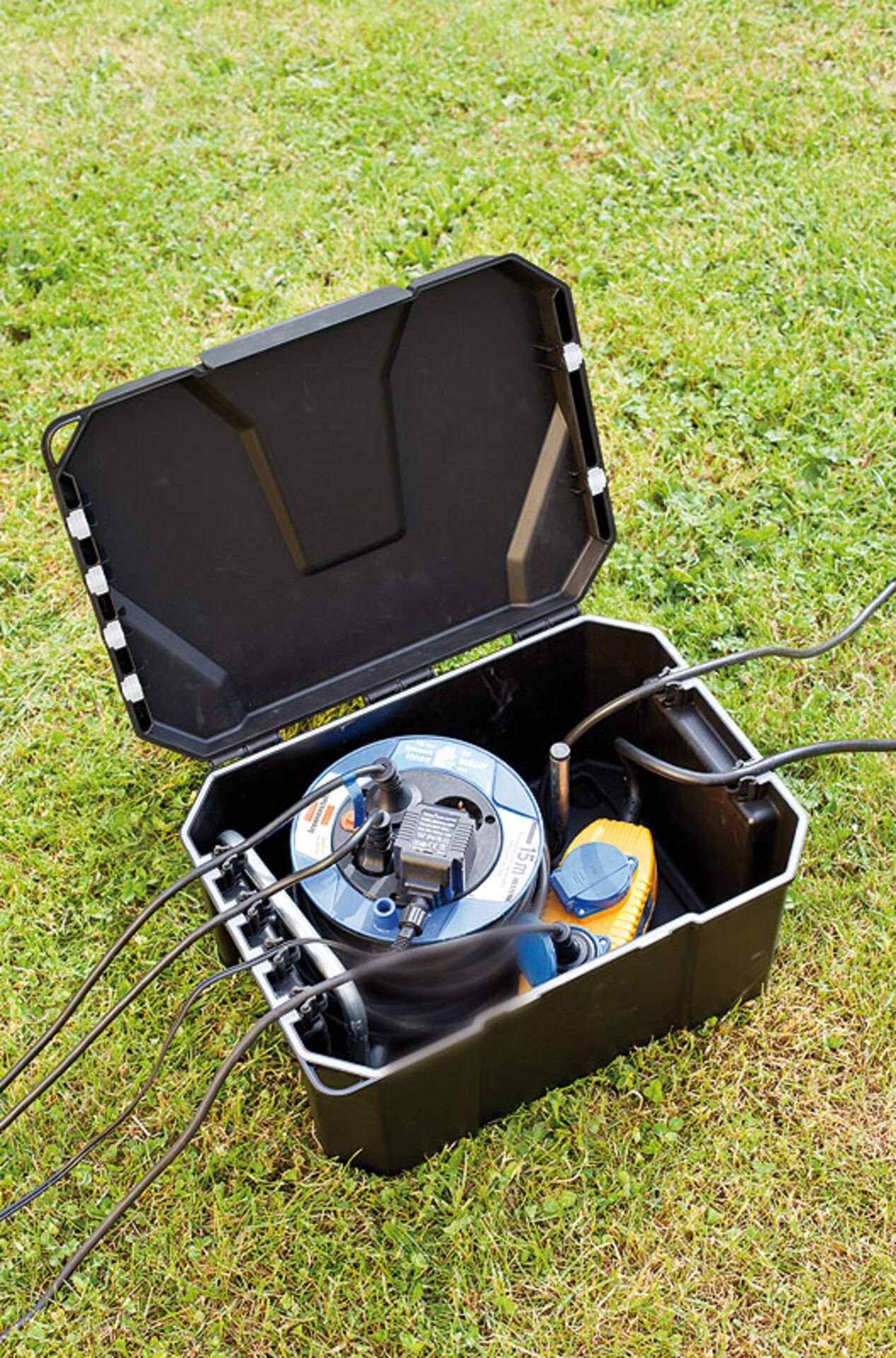 Tento problém řeší zahradní bezpečnostní úložiště Power Box, umožňuje centrální, bezpečné a čisté uložení rozvodů elektrických kabelů. Rozměry boxu jsou 40 x 30 x 21 cm a nabízí dostatečné místo pro prodlužovací lišty, prodlužovák bubnový, časovače, atd..
