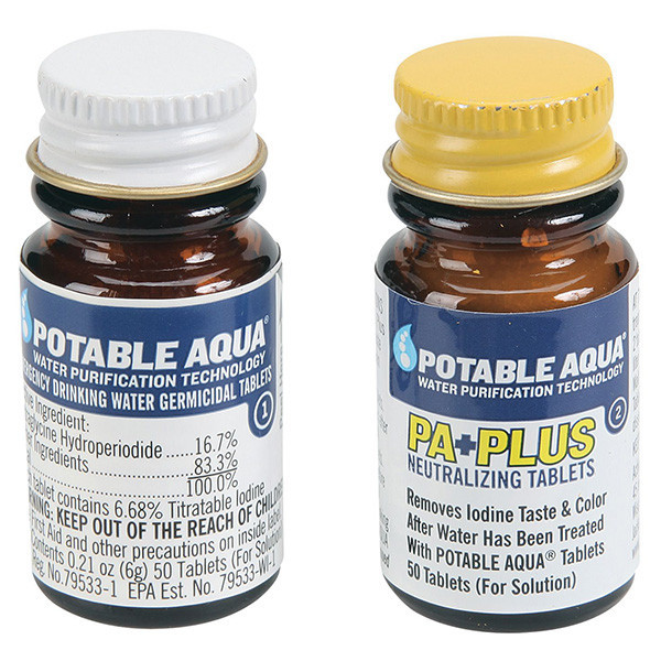 Tablety POTABLE AQUA pro nouzové vyčištění vody tak, aby byla pitná. V balení tablety P.A.Plus, které neutralizují chuť jódu po použití tablet POTABLE AQUA. číst celé