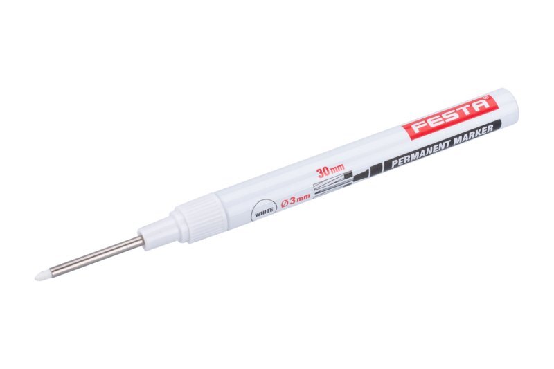 permanentní hloubkový značkovač - bílý průměru hrotu jen 3 mm, umožňuje značení malých průměrů skrz až 30 mm silných materiálech použitelný na většinu povrchů