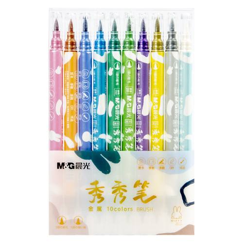 Sada metalických popisovačov od značky M&G. Sú obojstranné, každá strana má inú hrúbku stopy.