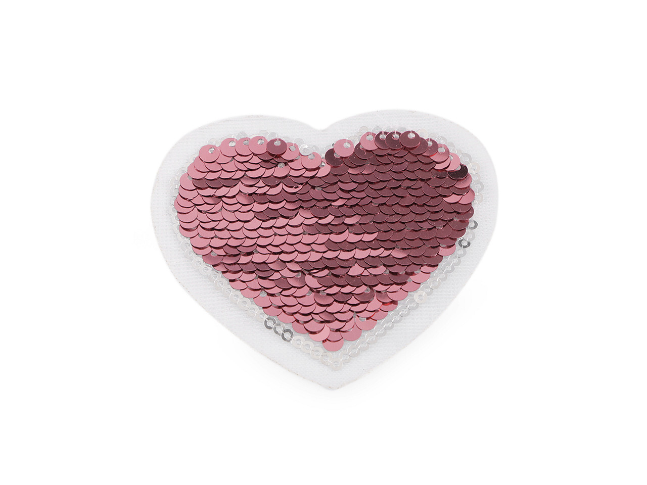 Nažehlovačka srdce, je po bocích zdobená stříbrnými flitry. Flitry uvnitř srdce jsou důmyslně našité, po jejich pohlazení proti směru se otočí a ukáží svou druhou, jinak barevnou stranu. Jsou oblíbené zejména u dětí a teenagerů, kteří si tak mění vzhled svého oblečení. Nažehlovačky mají kvalitní provedení, spodní stranu tvoří lepicí vrstva, která po nažehlení pevně drží na látce.